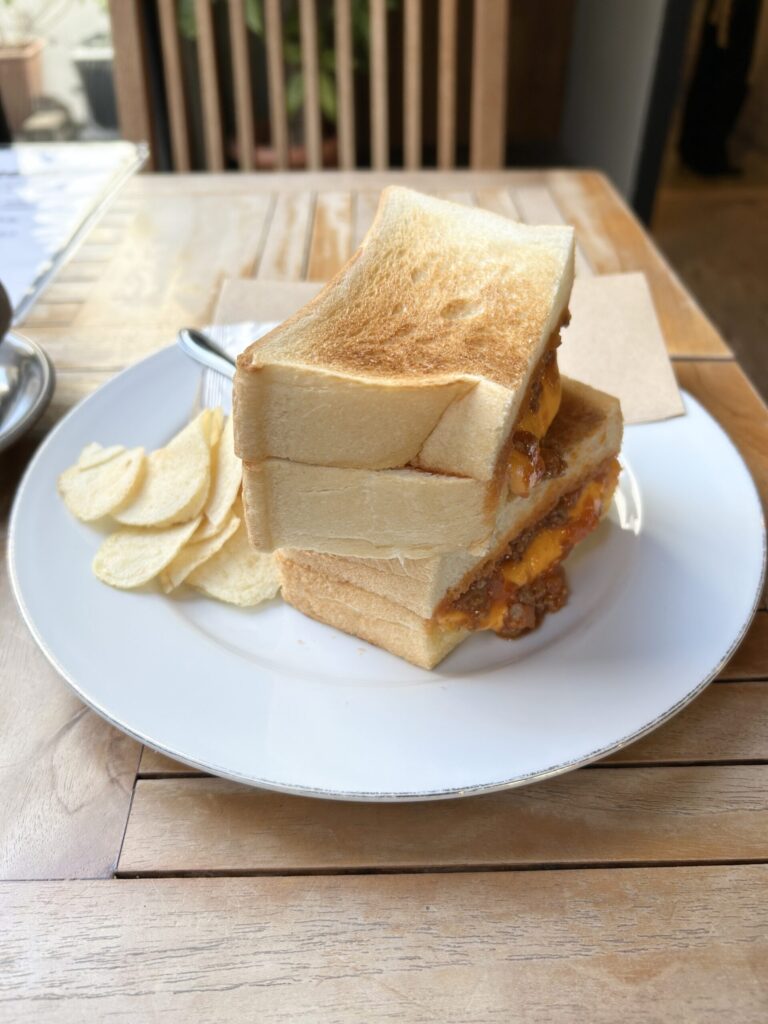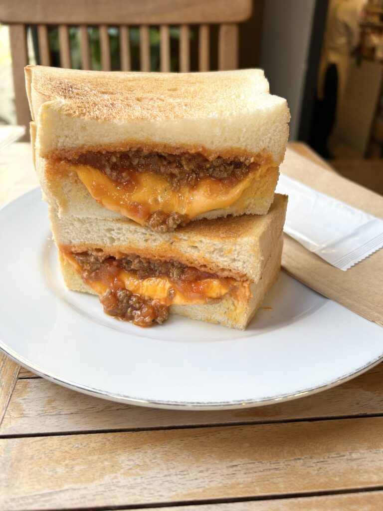 それと今回食べてみたいと思っていた、スロッピージョーサンドイッチ、「アメリカアイオワ州の郷土サンドイッチ。自家製トマトミート煮込みと野菜を厚切りの生食パンに挟み込み濃厚なチェダーチーズを贅沢に挟んだやみつきになる1品。」とある。こちらもオーダー。