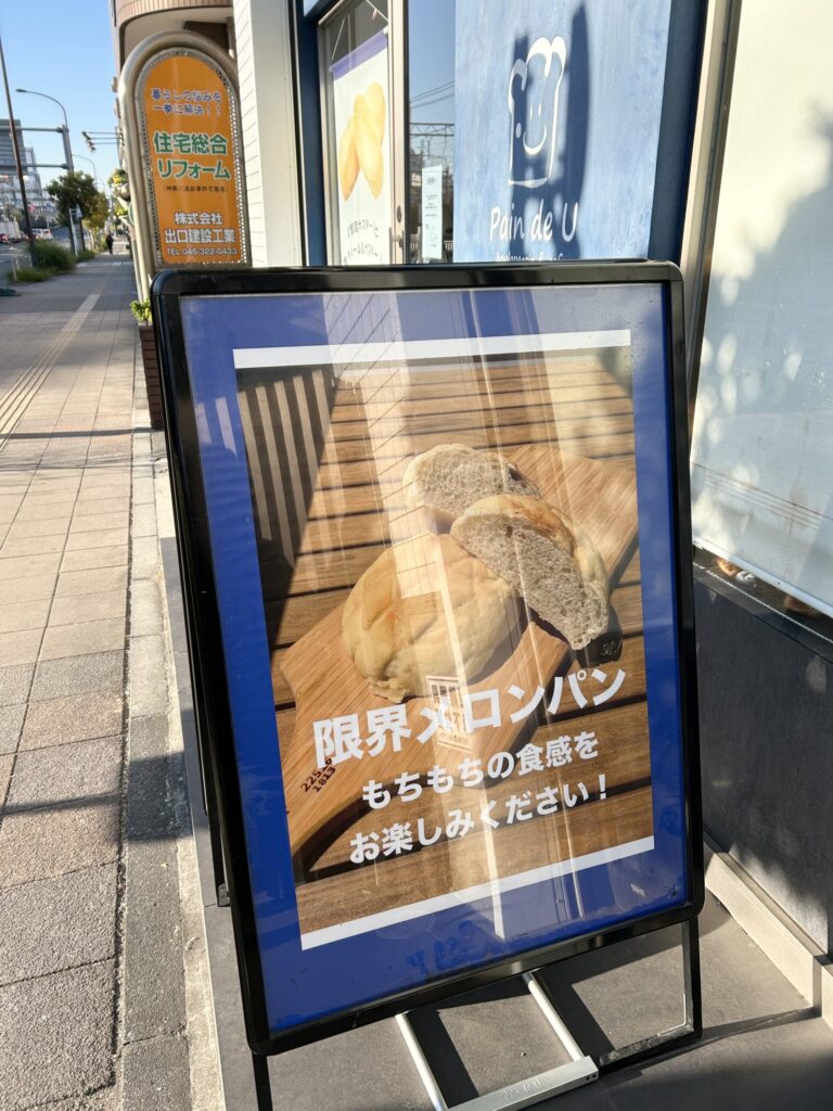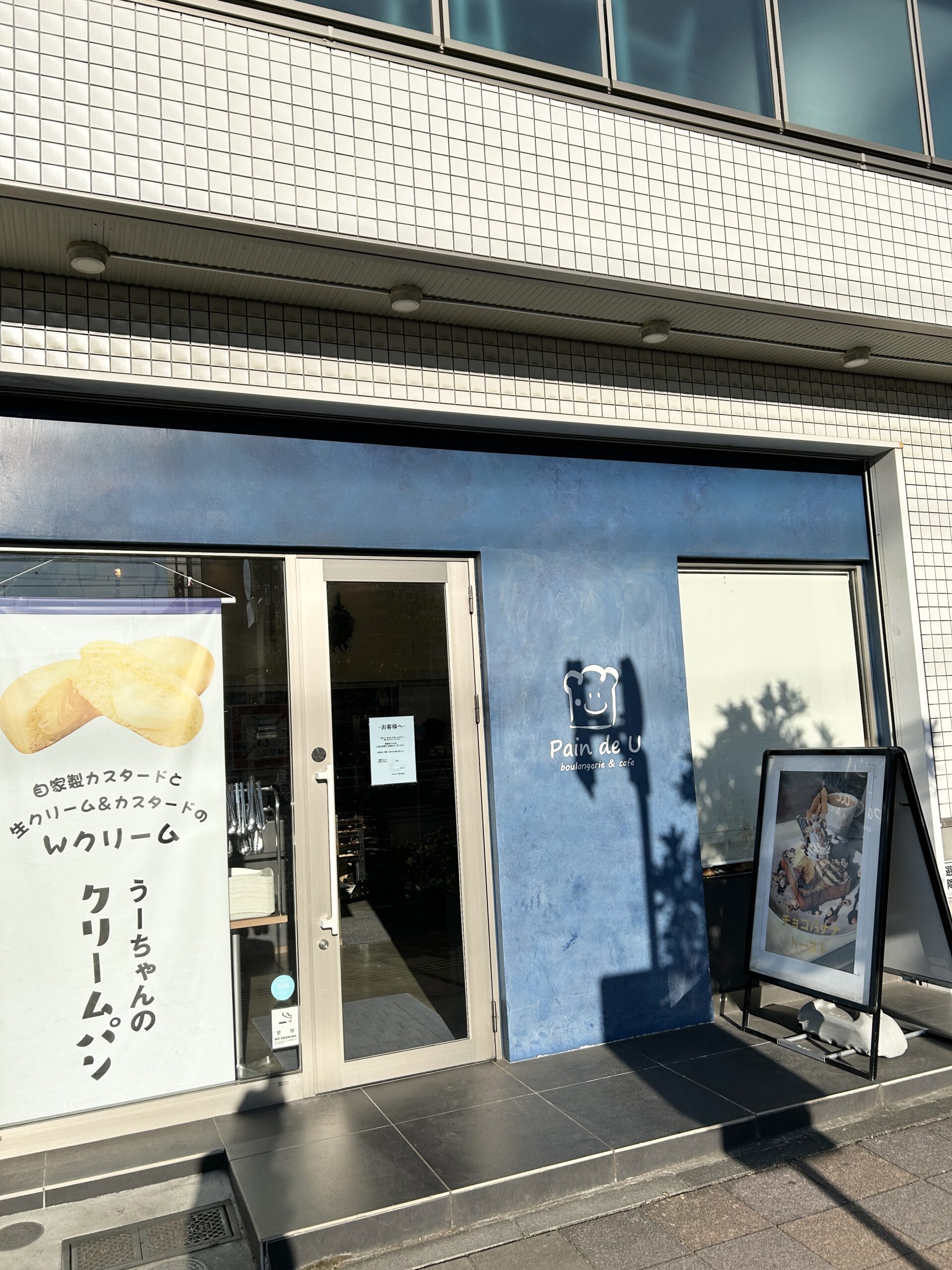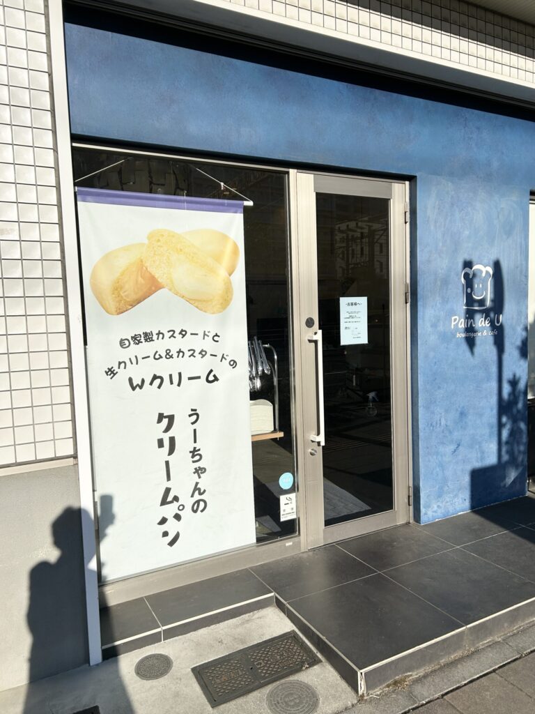 外観は青色の目立つ色彩、看板も出ていてオシャレなパン屋という感じ。