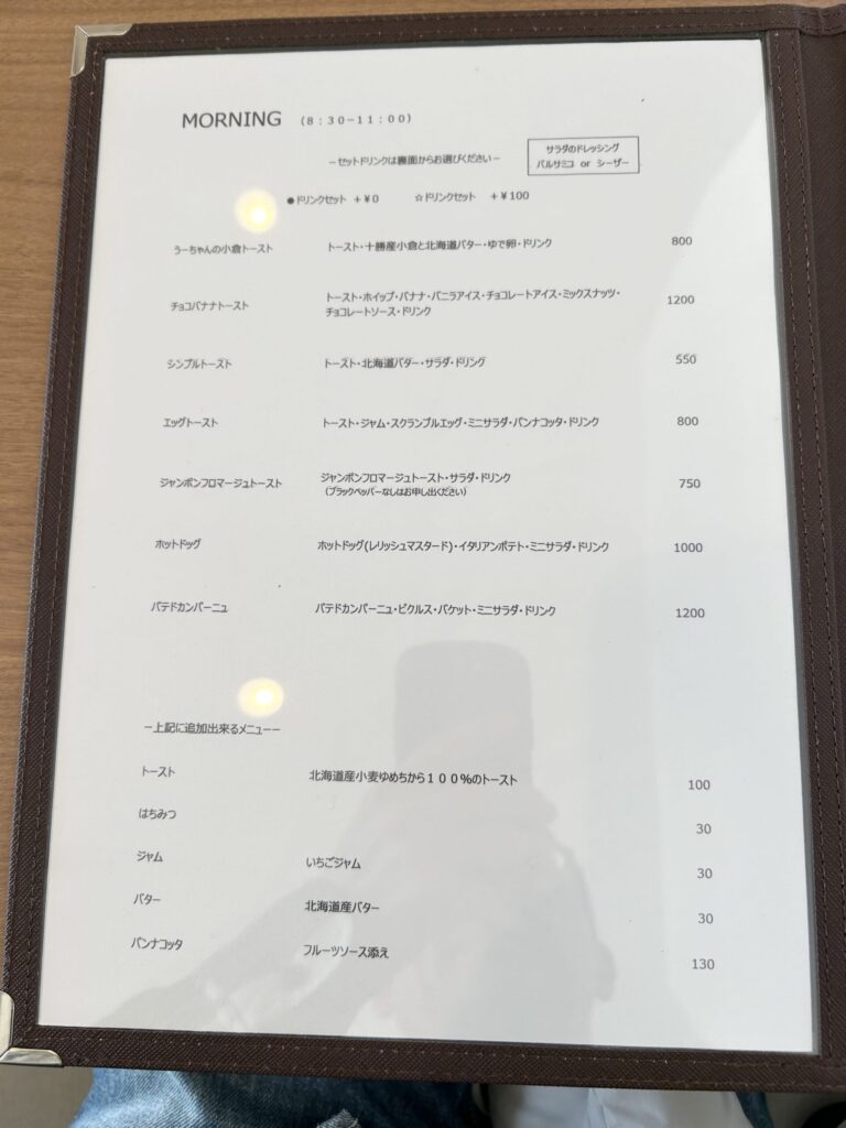 今回はモーニング利用なので、モーニングメニューを見てみる。パン屋のカフェなのでパン主体のメニュー構成だ。種類は豊富。迷うほどのパンメニューがある。