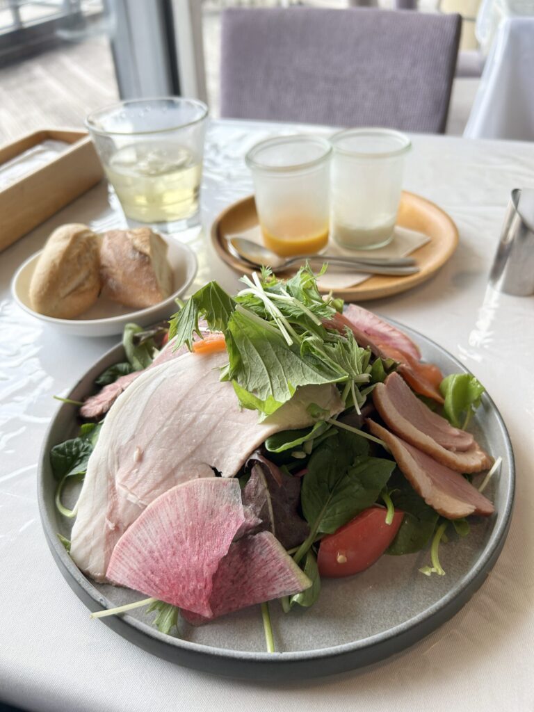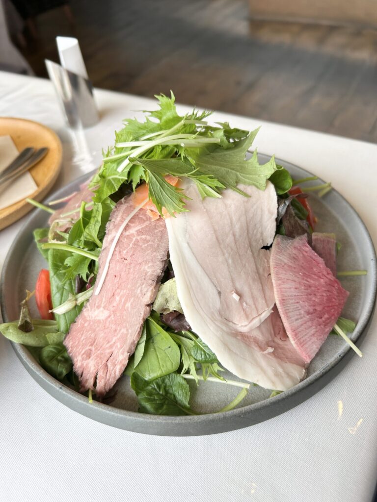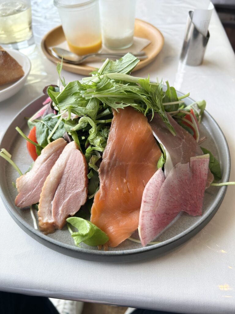 この山盛りのサラダ、食べれるか不安もあったが、上に盛られているお肉、サーモン、それとドレッシングが美味しくて、完食できた。