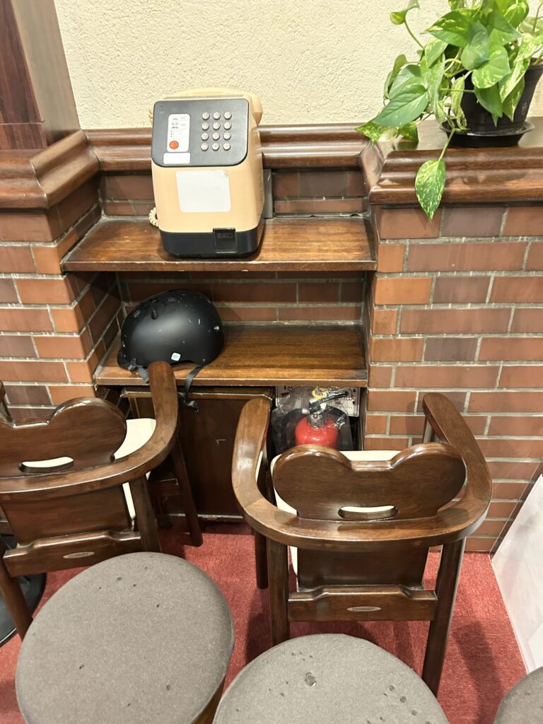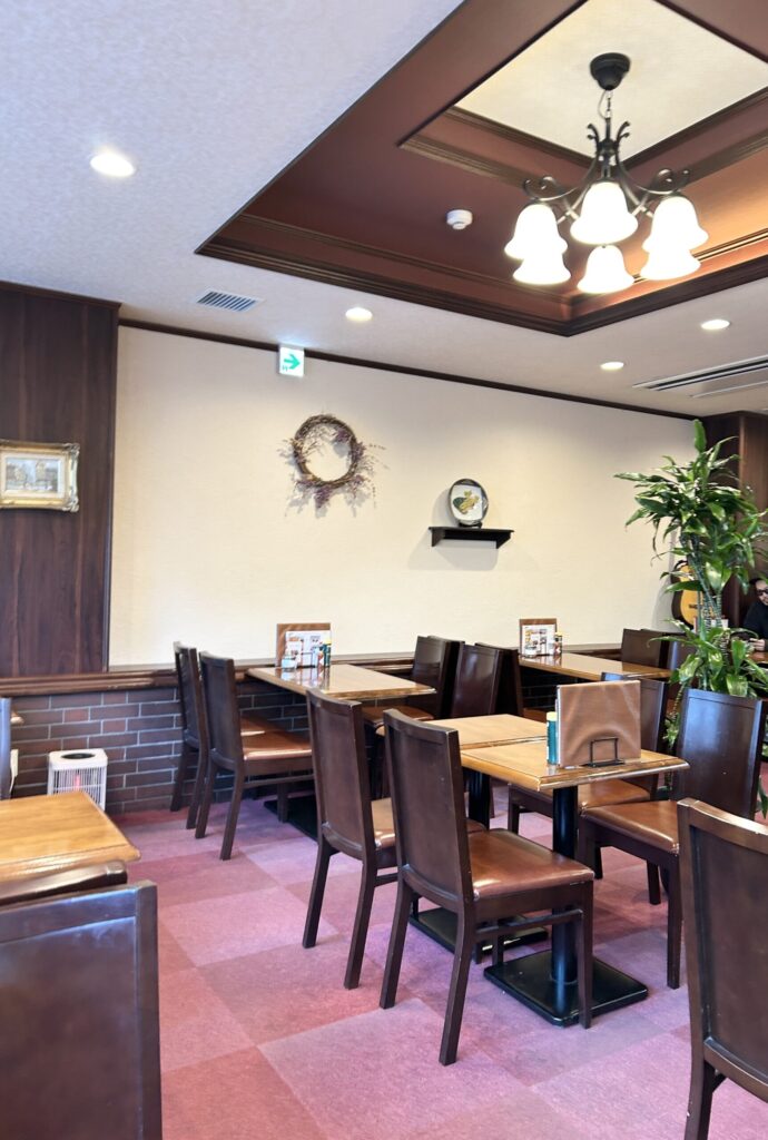 昭和のレトロ喫茶を体感できるカフェだ。入口からレトロ感が伝わってくる。カーペット敷きの床、椅子、テーブル、レンガの壁、天井の照明、さらに席はすべて4人席。