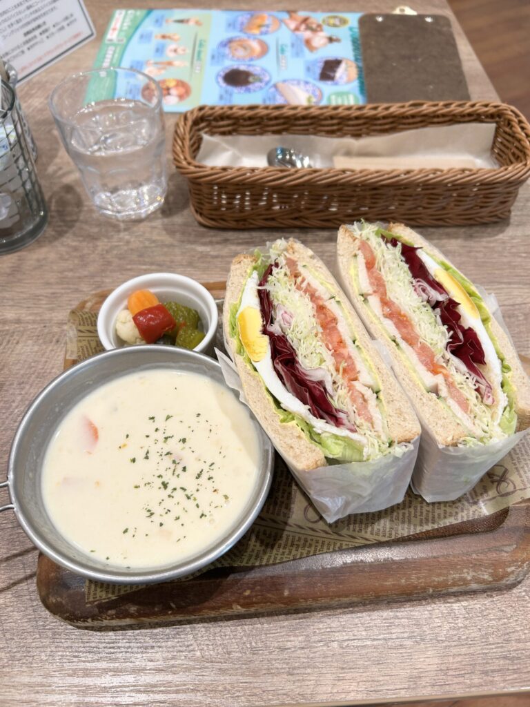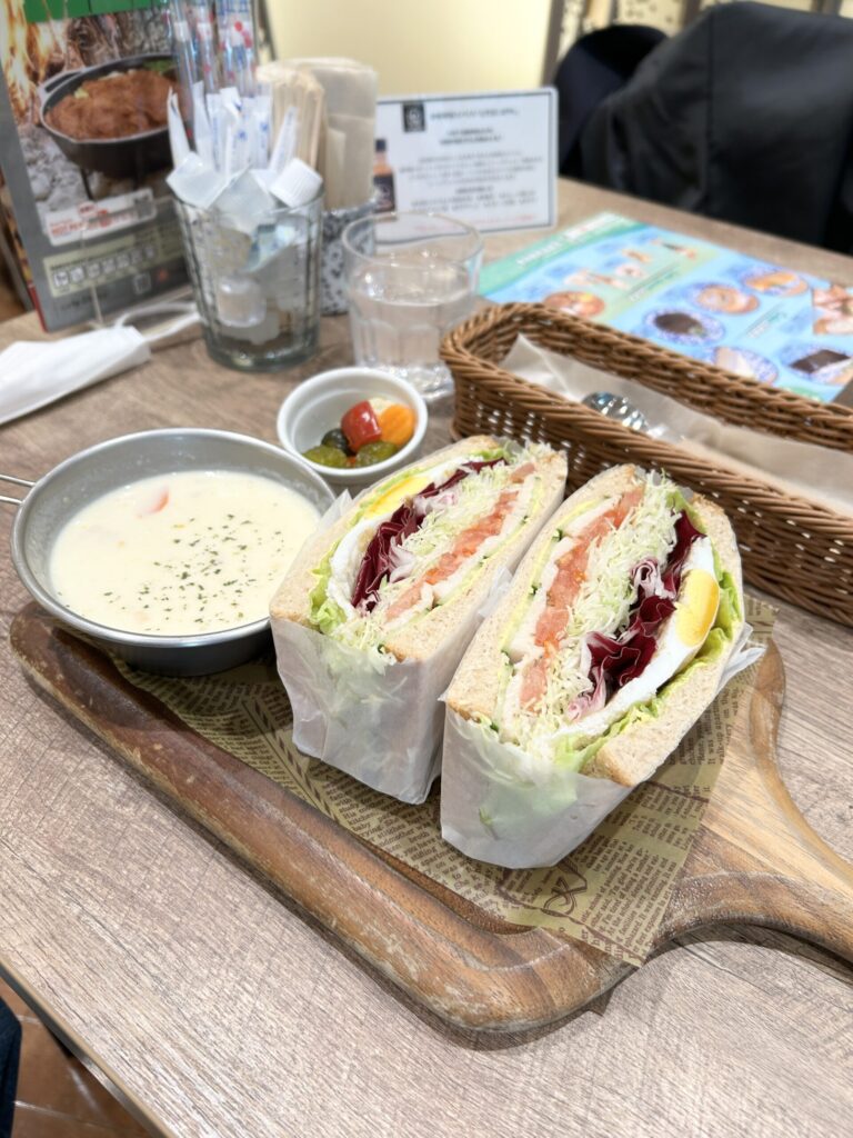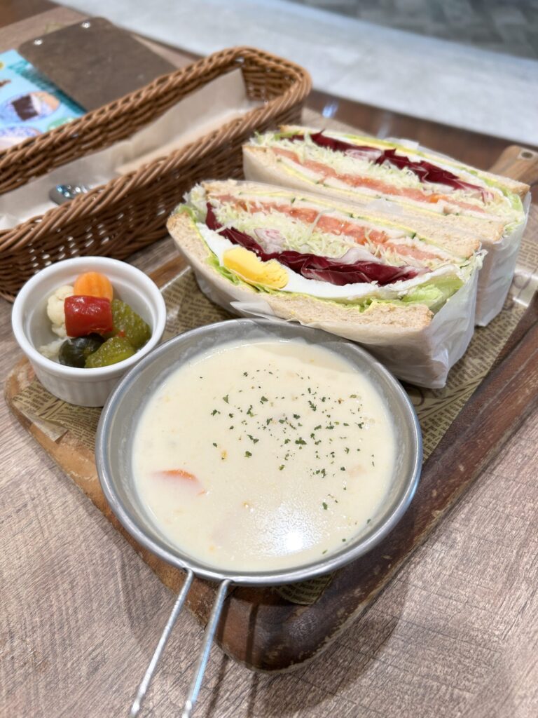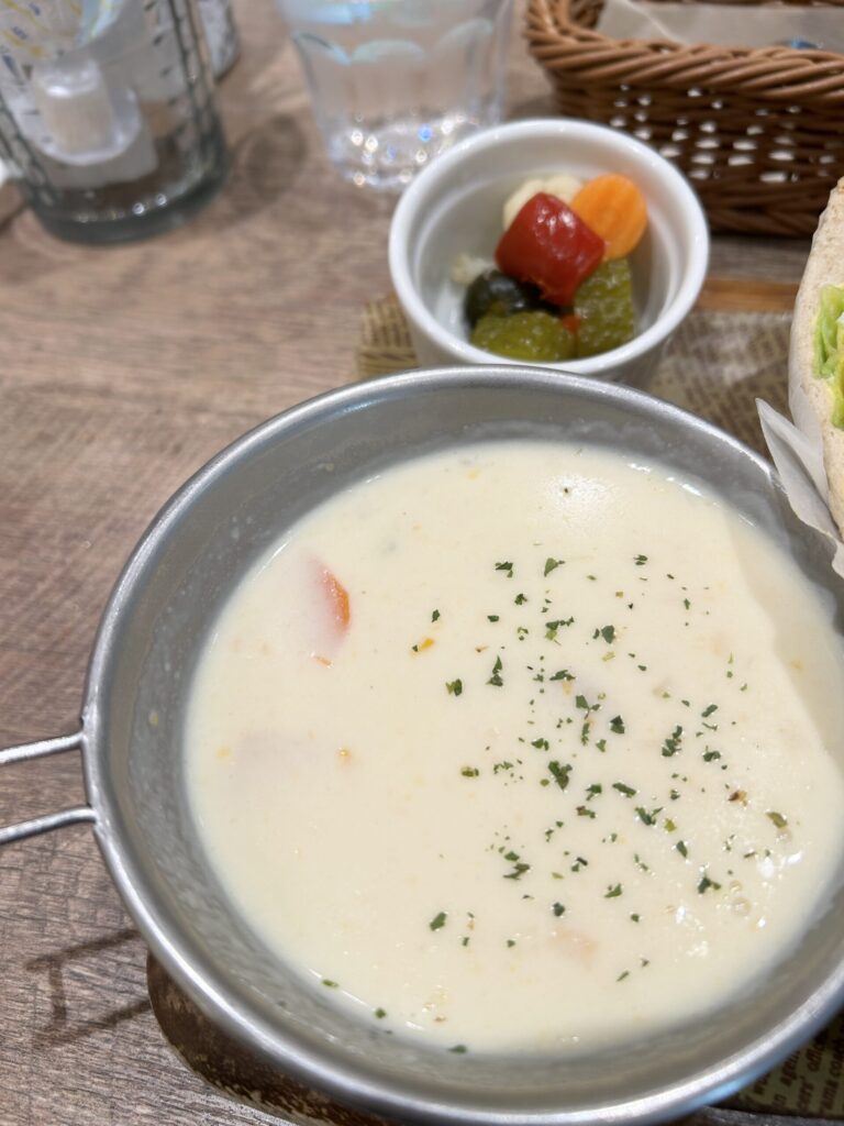 今回はランチとしての利用、まずはホワイトチキンサンド、これには季節のスープが付く。