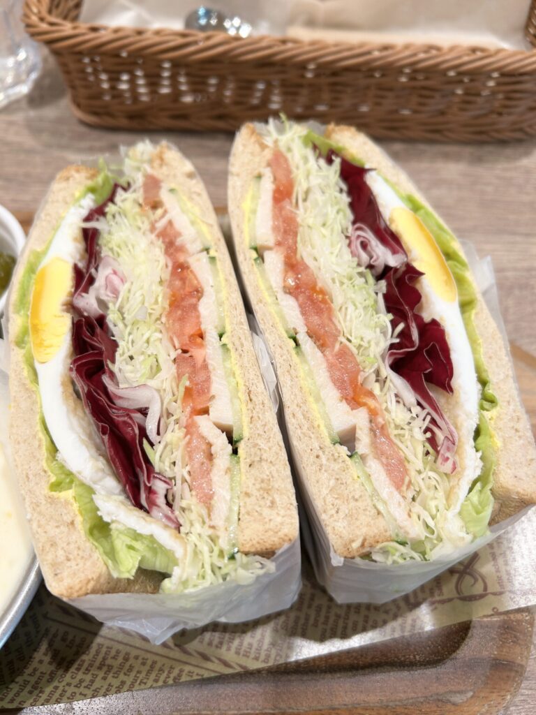 ホワイトチキンサンド、この野菜のボリュームは凄い。2つあるが、1つでも十分というほど圧巻のボリュームだ。