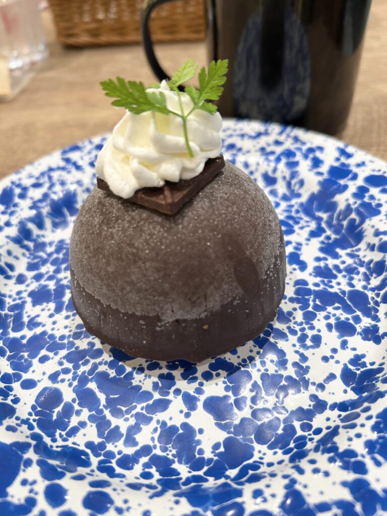 デザートは、3層チョコの濃厚ドームケーキとデザートセットドリンクのホットコーヒー。