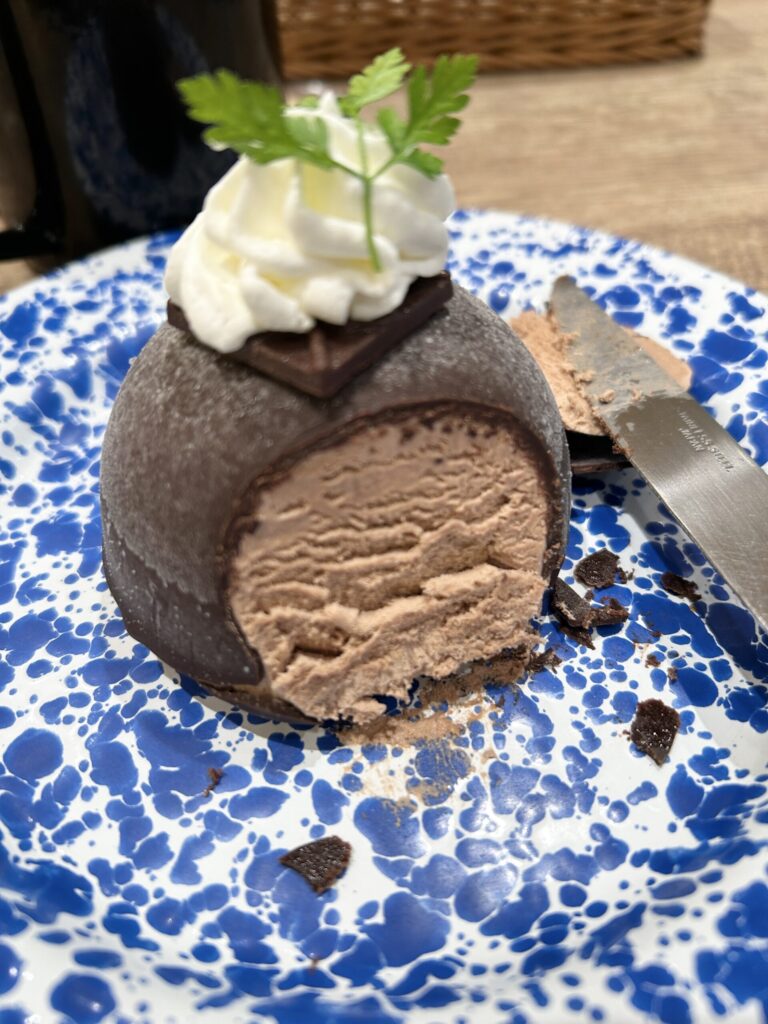 3層チョコの濃厚ドームケーキ、これはアイスのケーキだ。濃厚なチョコレートアイスを表面のチョコレートと下にあるクッキー生地が覆っている感じ。
