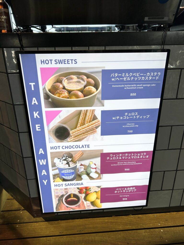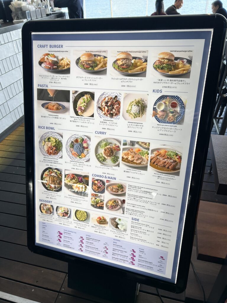 デザート類も含めて、かなりメニューの種類が豊富だ。テイクアウトのメニューも多い。外の大さん橋で飲食するのも最高に気持ちいい。