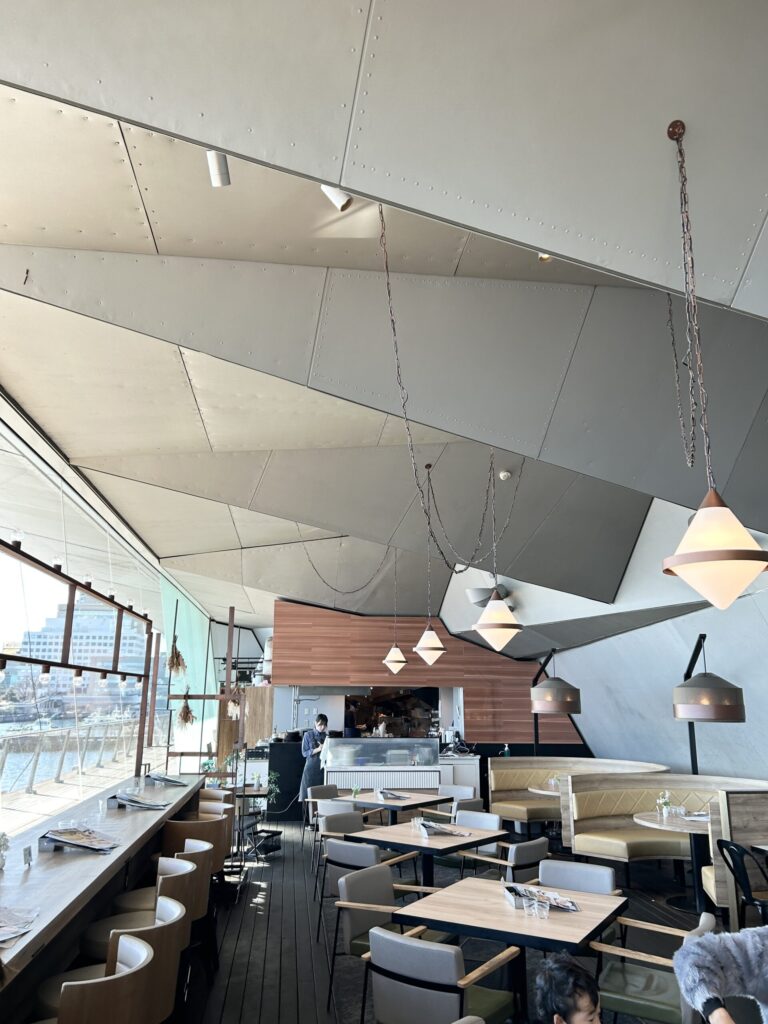 大さん橋の室内にあるカフェレストランという感じだ。目の前に、横浜ベイブリッジや、マリンタワーが見える絶景カフェレストランだ。