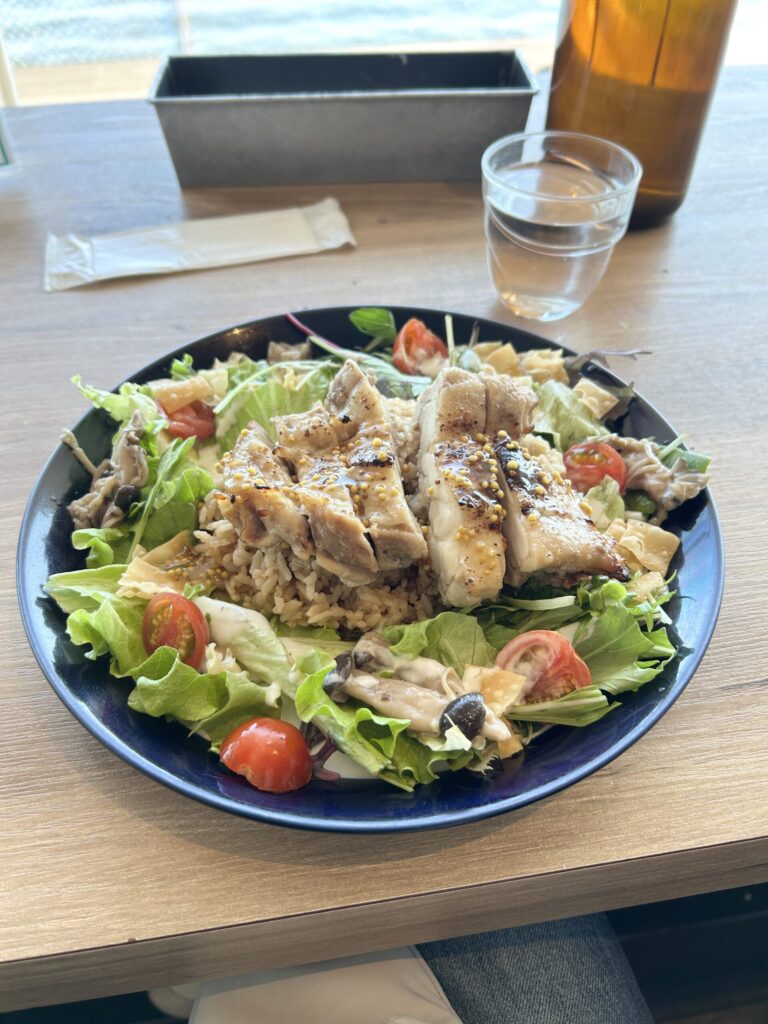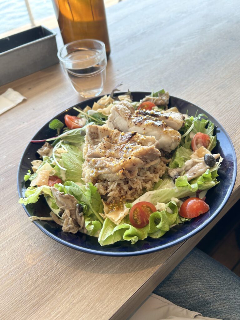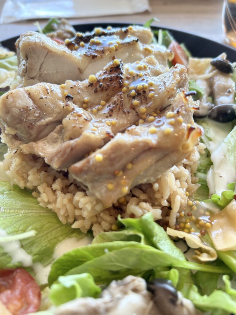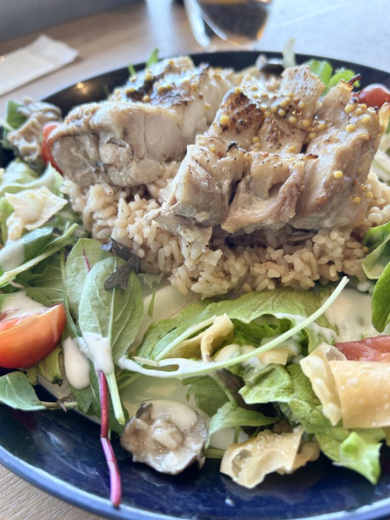 グリルチキンオーバーライス、このグリルチキンと生野菜のボリュームが凄い。よく見ないとライスが見えない状態だ。ハニーマスタードとなっているが、それほどマスタードが効いてる感じもなく食べやすい。ライスもしっかり味付けされていて美味しい。満足のいく一品だ。
