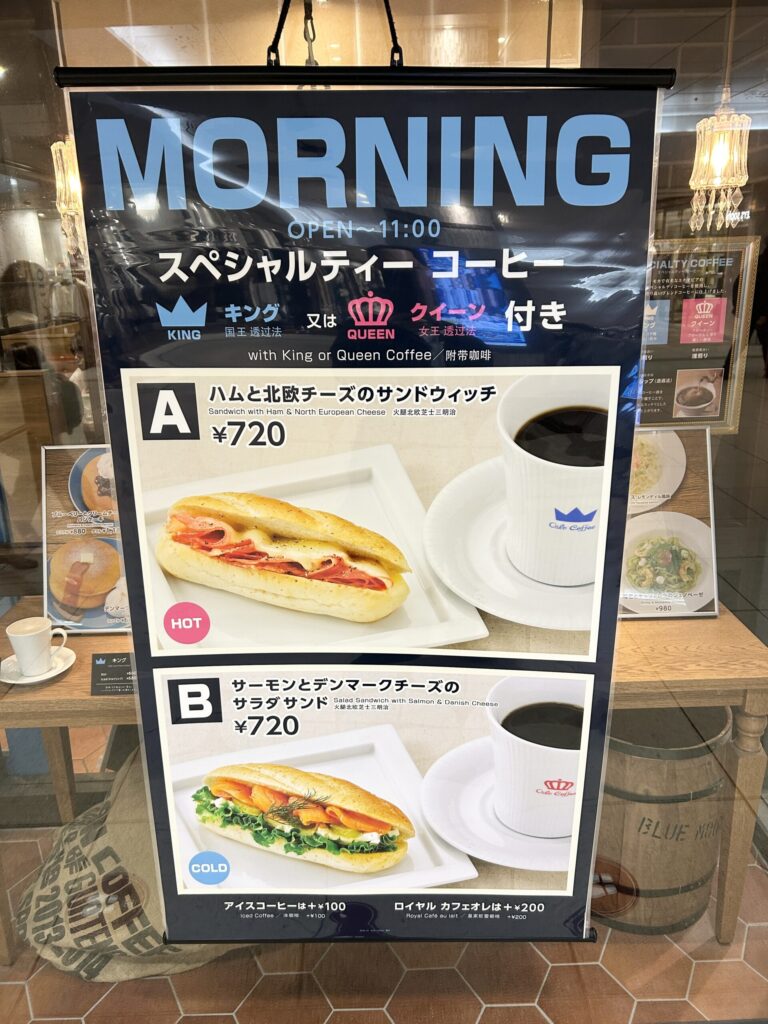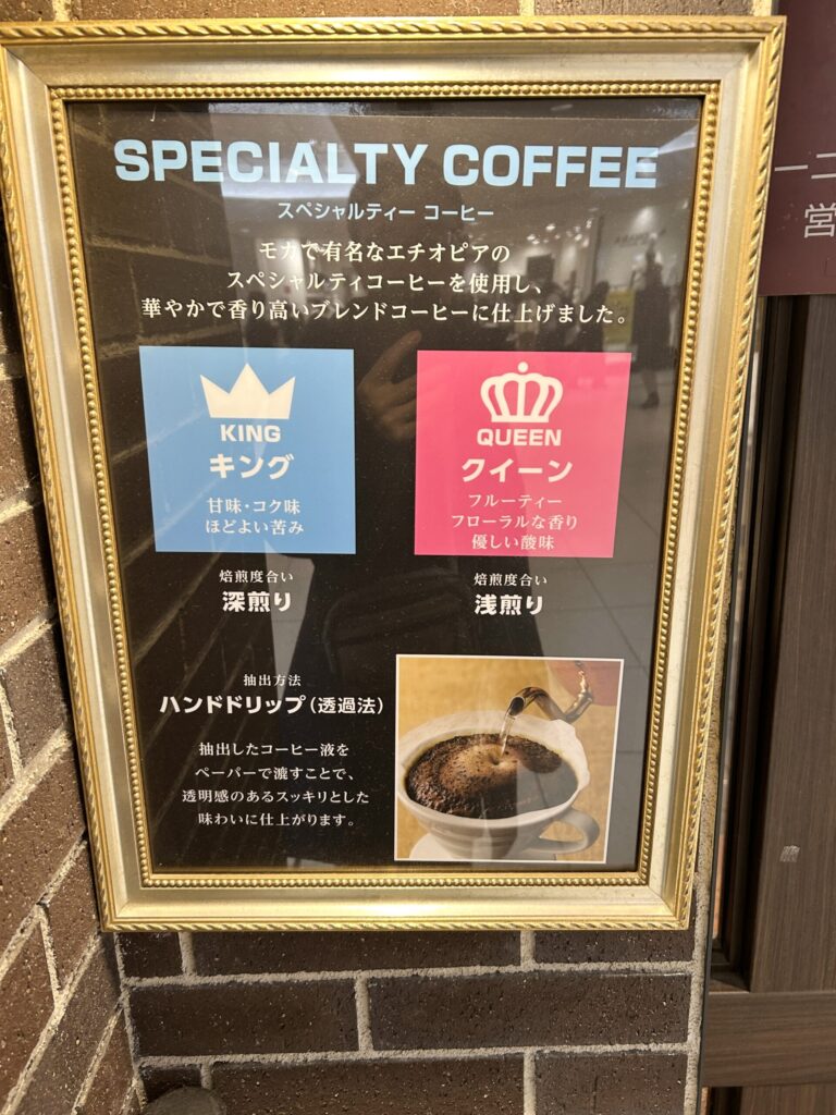 スペシャルティーコーヒーキング、「モカで有名なエチオピアのスペシャルティーコーヒーを使用し、華やかで香り高いブレンドコーヒーに仕上げました。」とある。深煎りがキング、浅煎りがクイーンと2種類から選択できる。どちらも抽出方法はハンドドリップ。酸味を抑え、コクがある、深煎りの特徴的なコーヒーである。