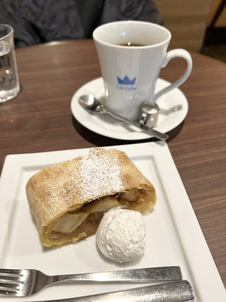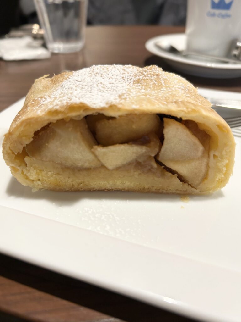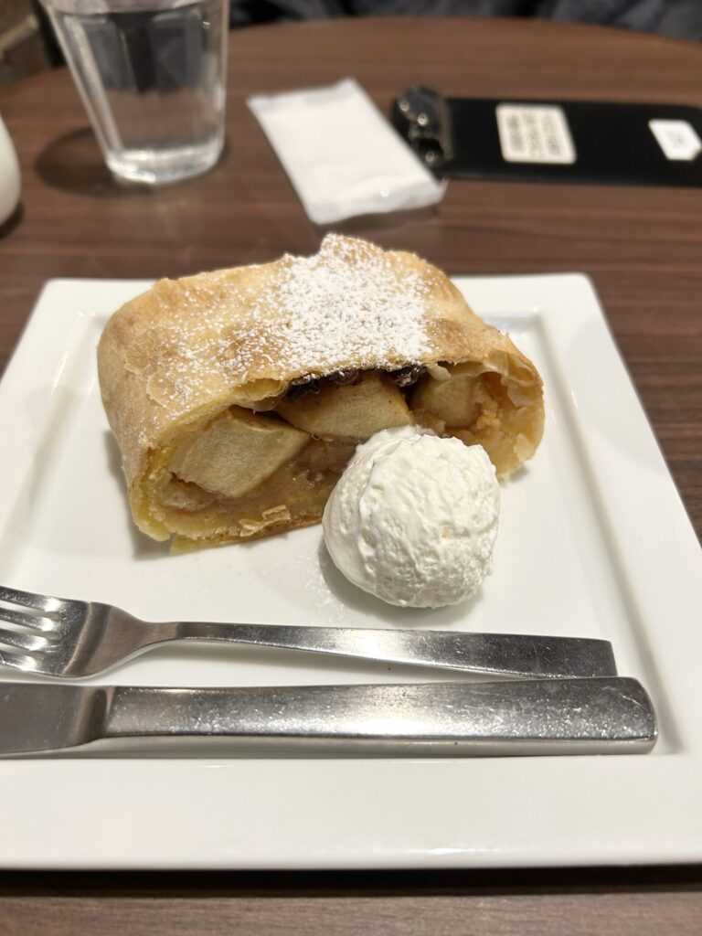 アップルステュルーデル ホイップクリーム添え、「じっくり丁寧に煮込んだりんごと、食感が残るようフレッシュのままシナモンで和えたりんご、ラム酒漬けのレーズンを薄いパイ生地に巻き込んで焼いたヨーロッパの伝統的なお菓子です」とある。この感じのアップルパイは初めて。りんごがゴロゴロとあり、かなりレベルが高いアップルパイだ。