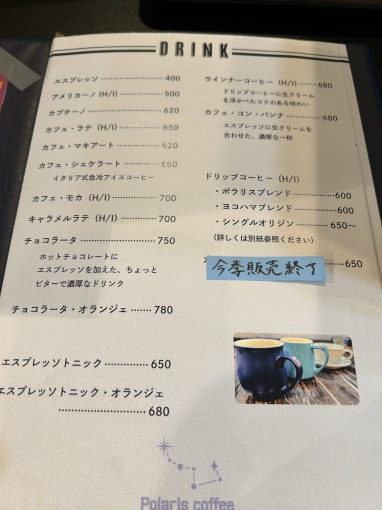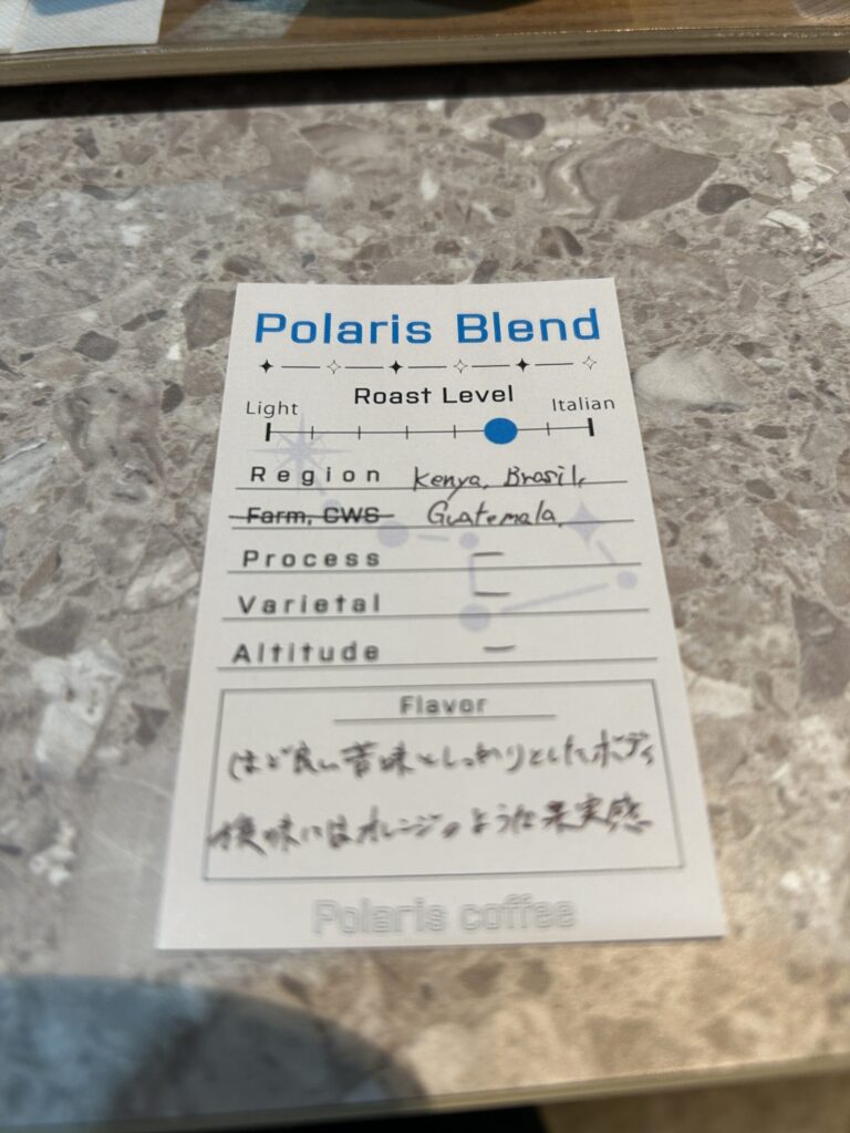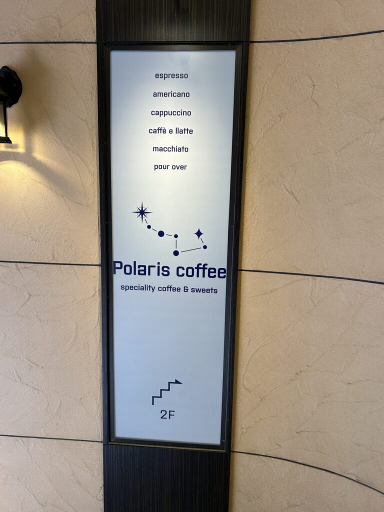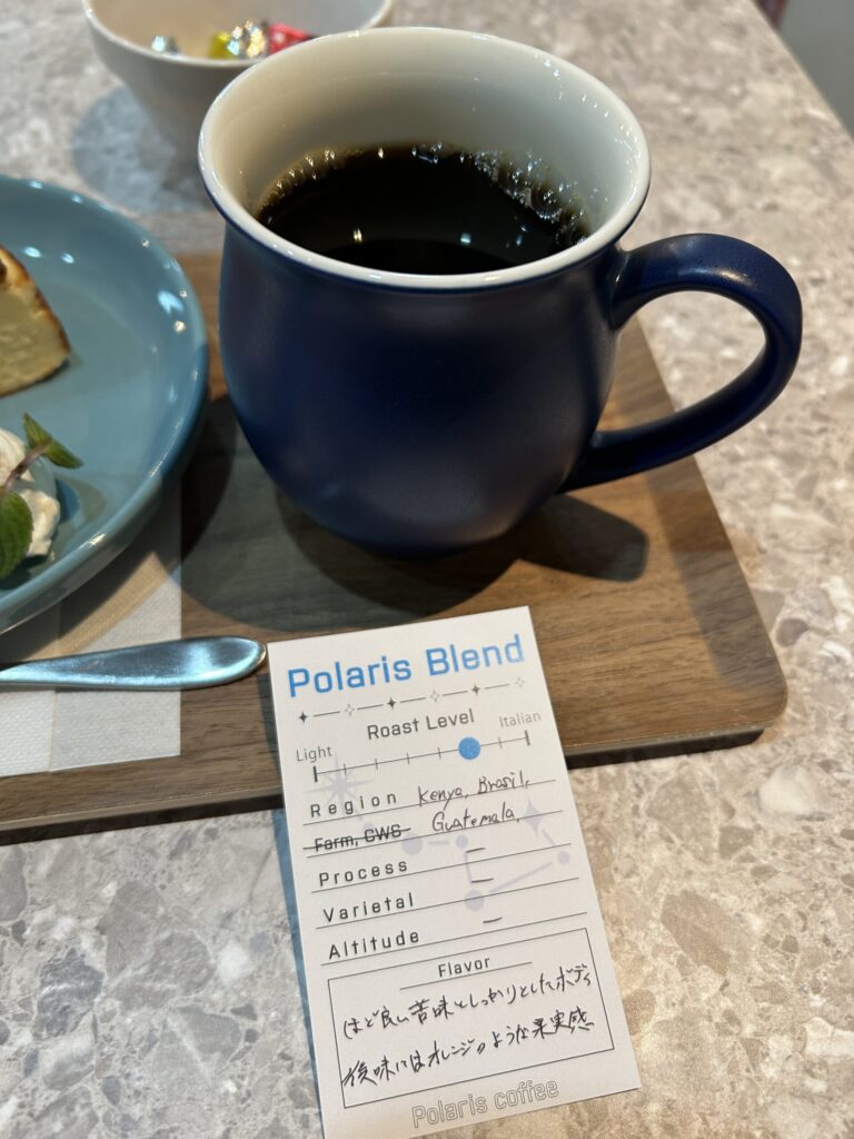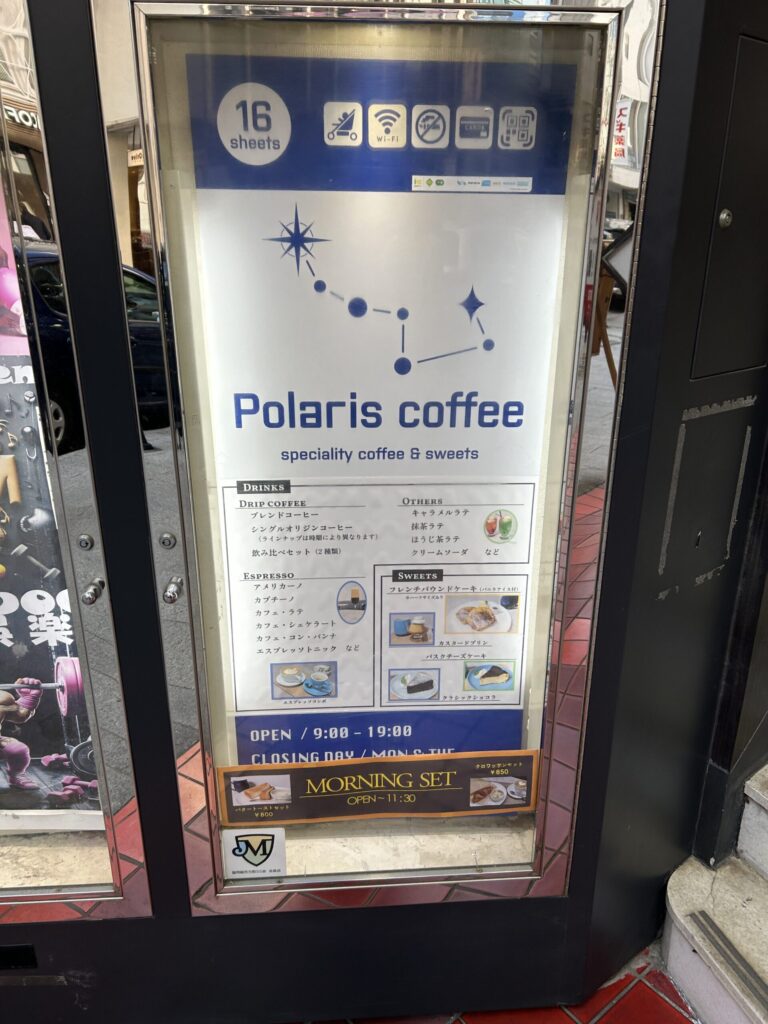 それが、Polaris coffee だ。「こだわりのコーヒーと本格エスプレッソ、それに合うスイーツが一緒にいただけるカフェ」とある。本格派のカフェだ。