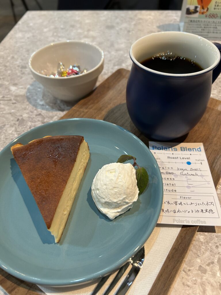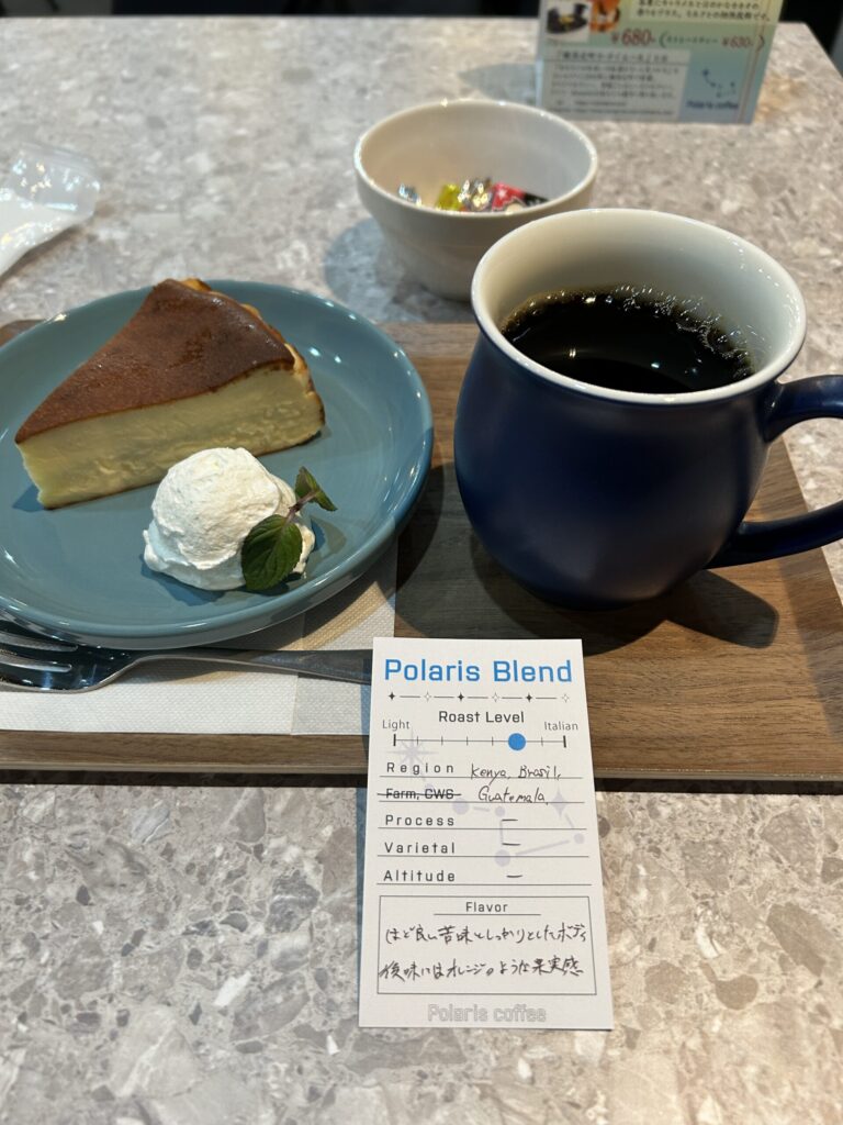 ここは、こだわりのドリップコーヒーを飲みたい。店名が付いているポラリスブレンド、それと店内で手作りというスイーツ、バスクチーズケーキをオーダー。