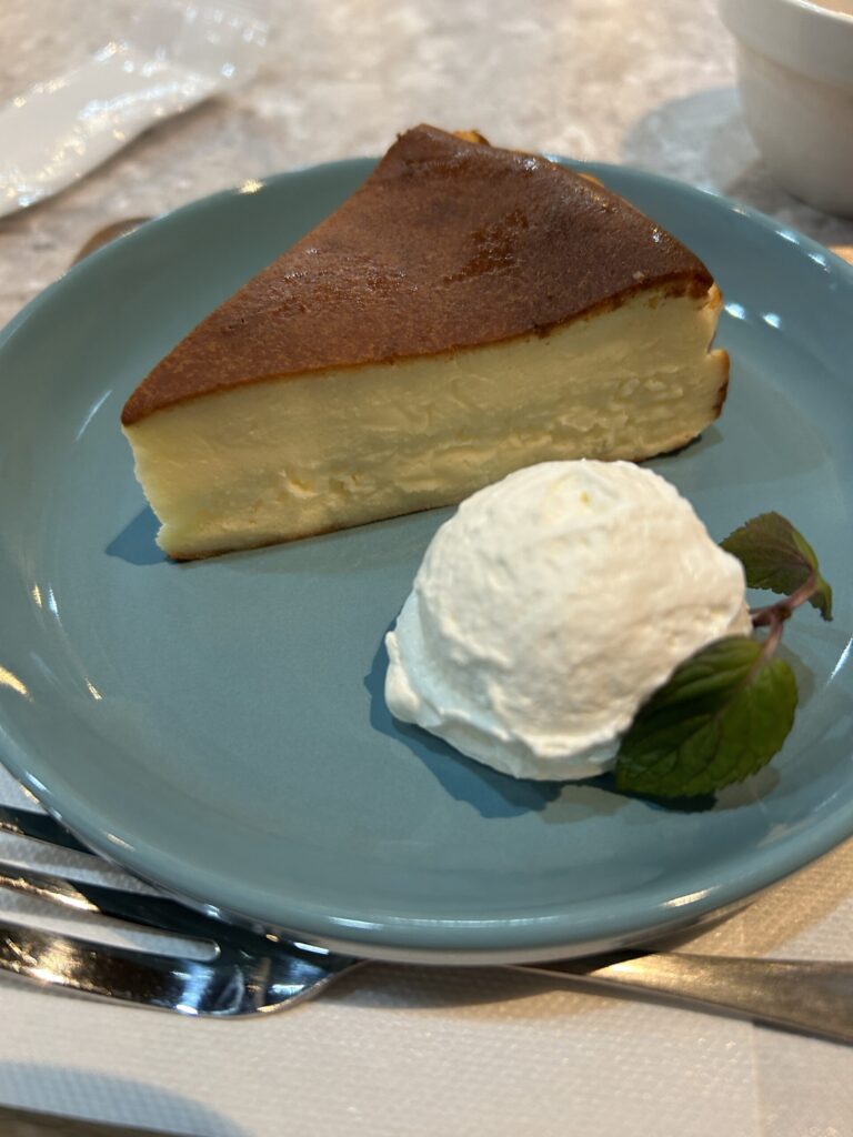 バスクチーズケーキ、口コミの評判がいい。確かに、コクのあるコーヒーにベストマッチする濃厚なチーズケーキだ。甘さを抑えた生クリームが、さらにコクを出してくれる。