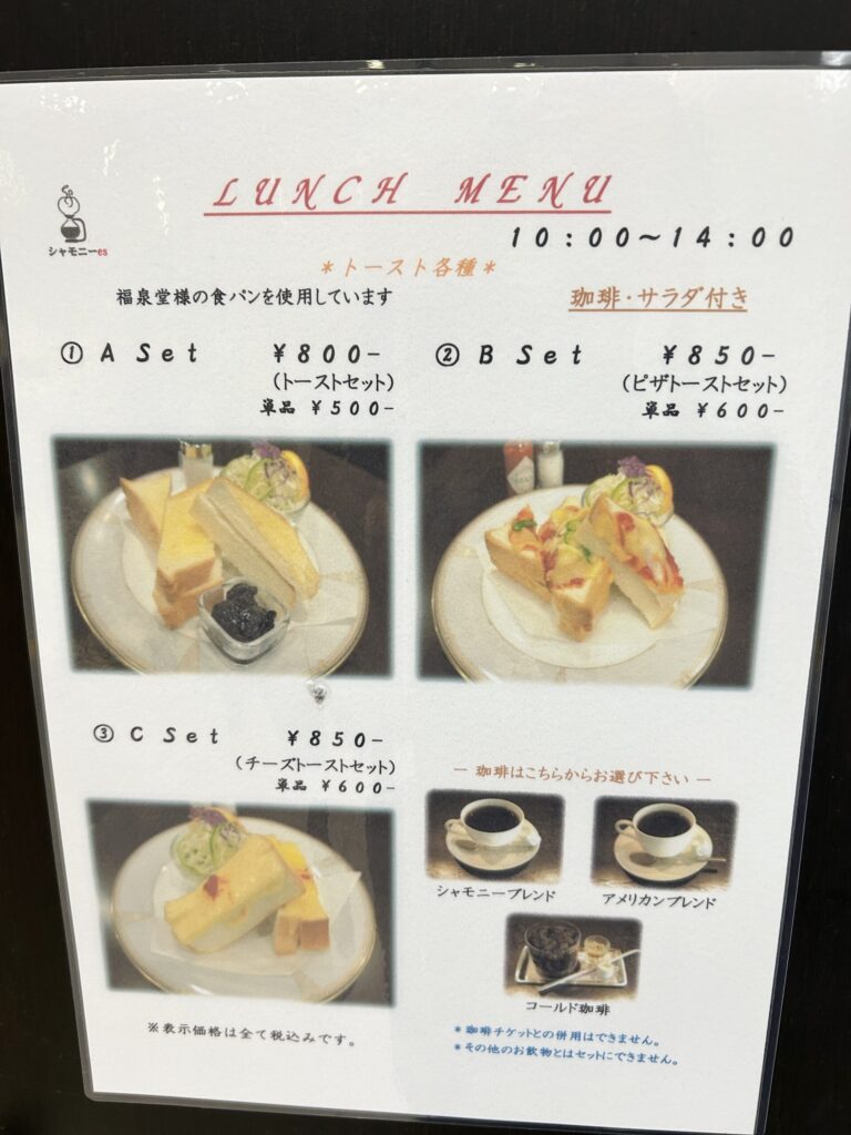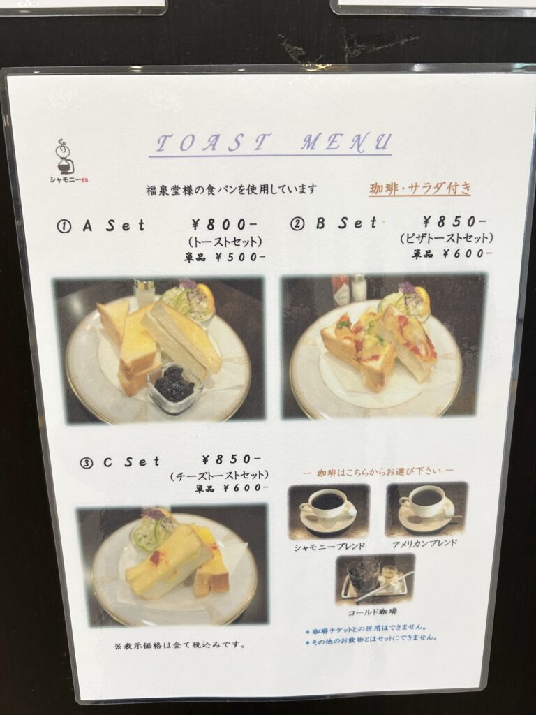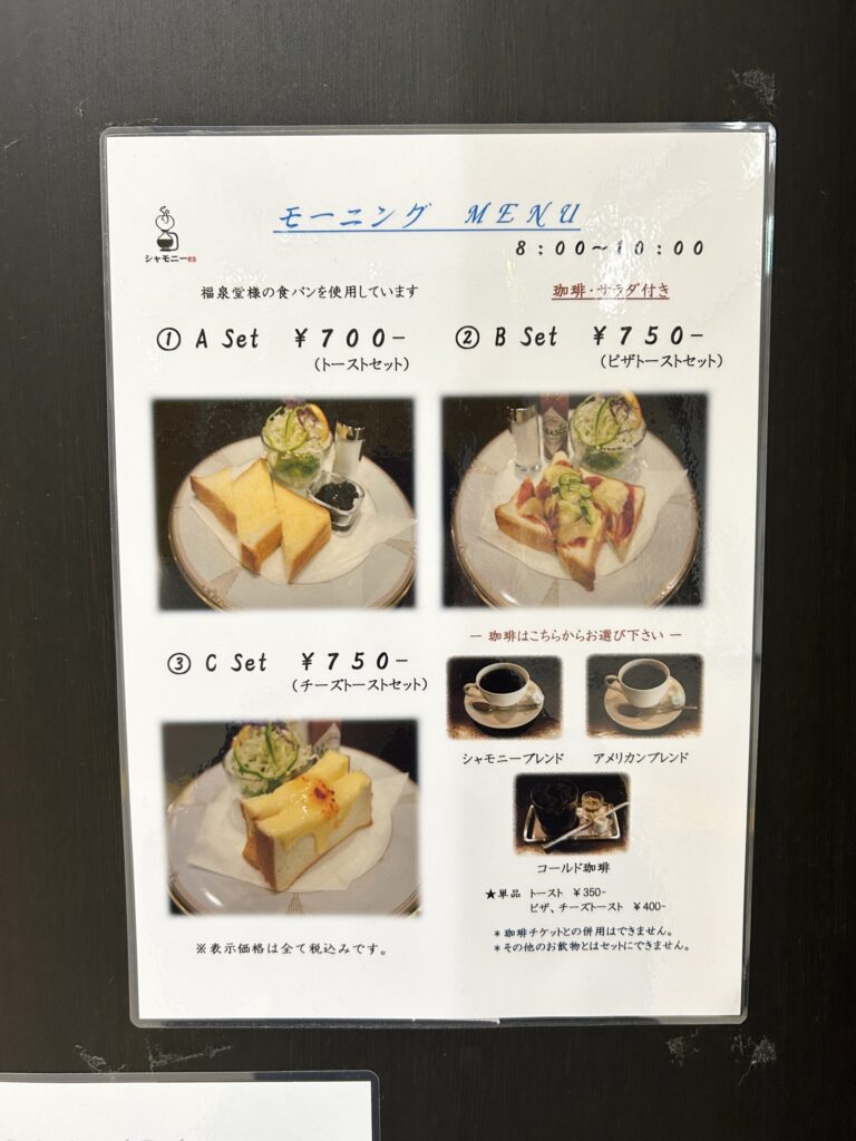 メニューもなんかレトロ感があっていいなぁ。モーニングがあるので、ここは、ピザトーストセット、コーヒーはシャモニーブレンドをオーダー。