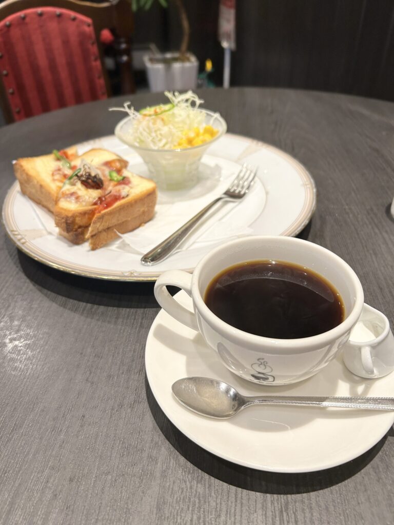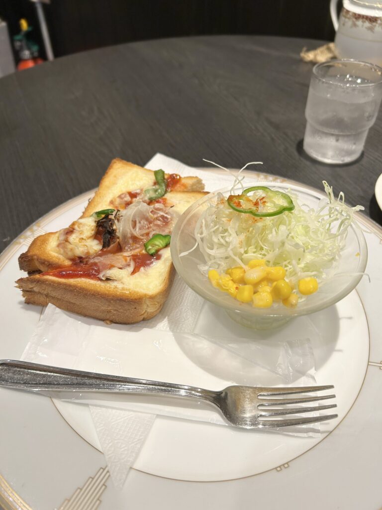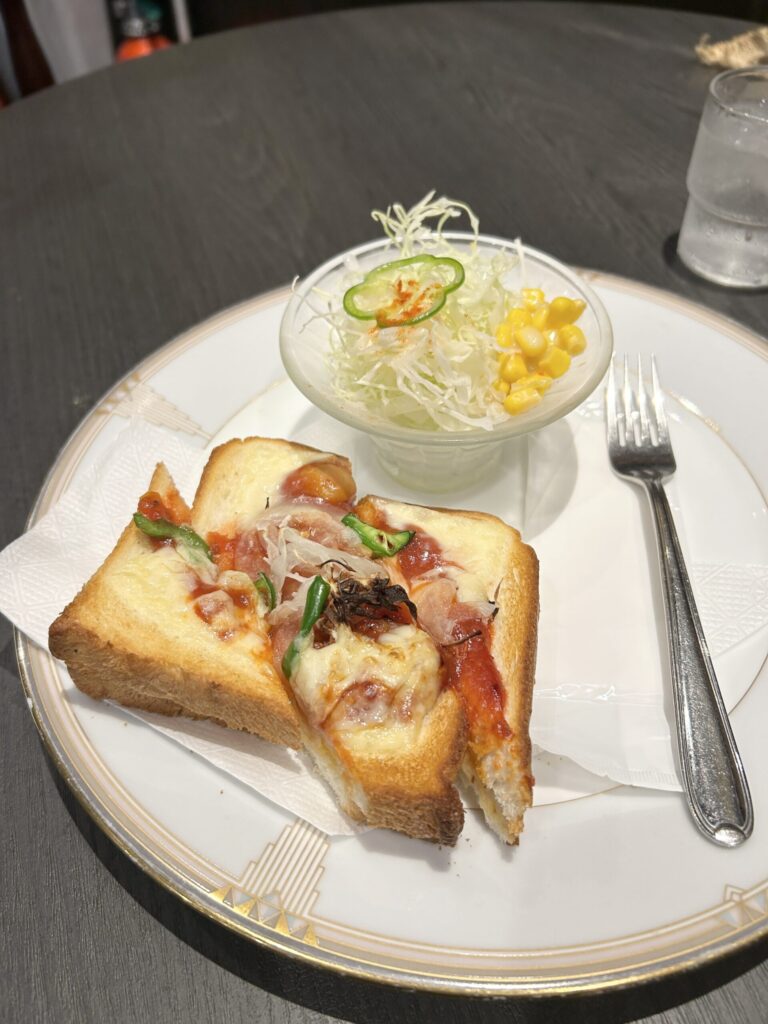 ピザトーストは、食べやすいように3等分にして出してくれる。薄切りのトーストを2枚重ねている。ボリューム的には物足りなさもあるが、味は美味しい。
