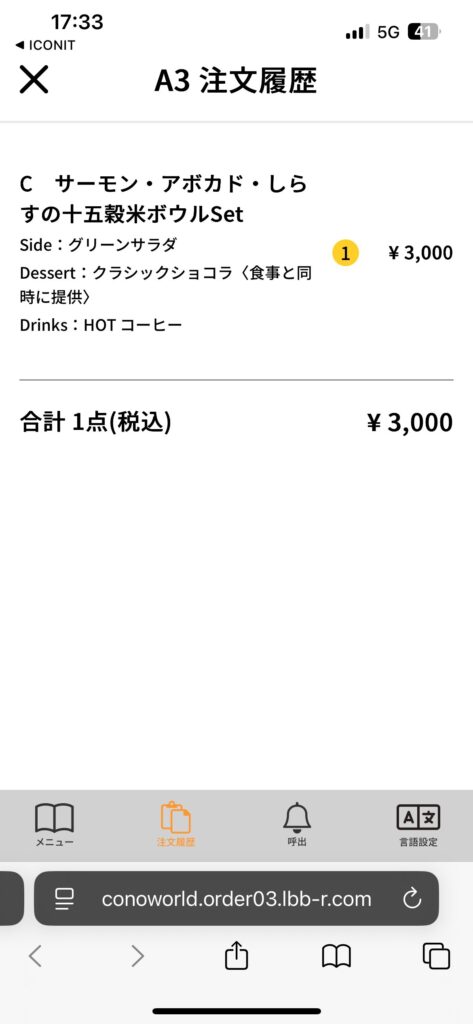 メインは、サーモン・アボカド・しらすの十五穀米ボウル、サイドメニューはグリーンサラダ、ドリンクはホットコーヒー、デザートは100円プラスでクラシックショコラ。