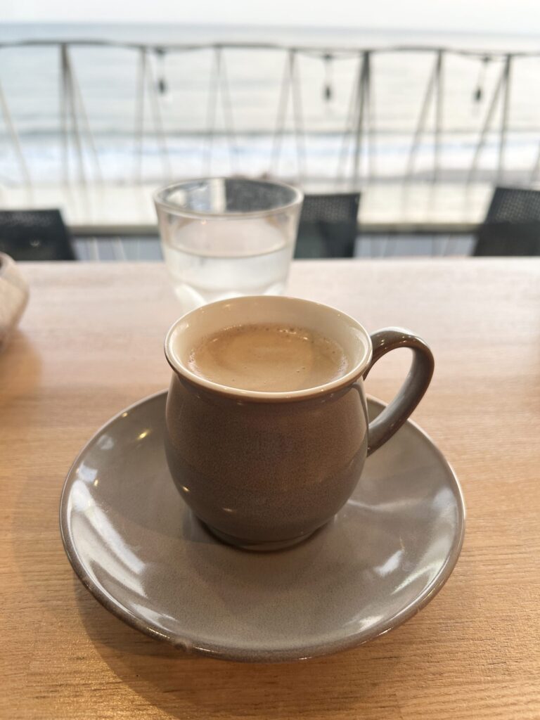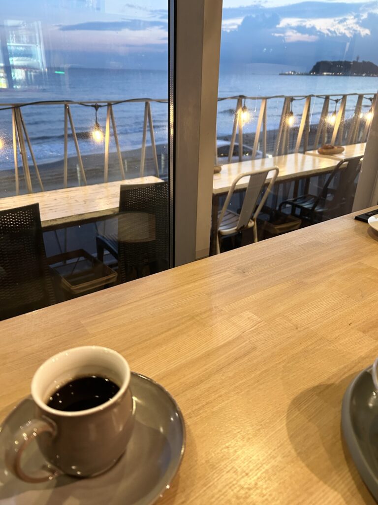 最初に出てきたのがホットコーヒー、夕暮れの海を眺めながら飲むコーヒーもいいもんだ。