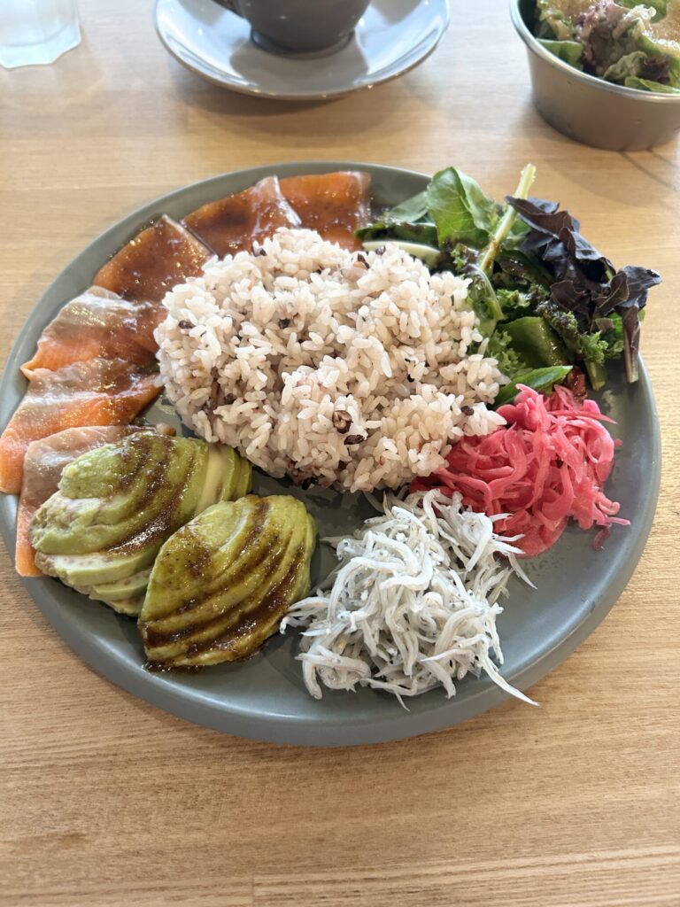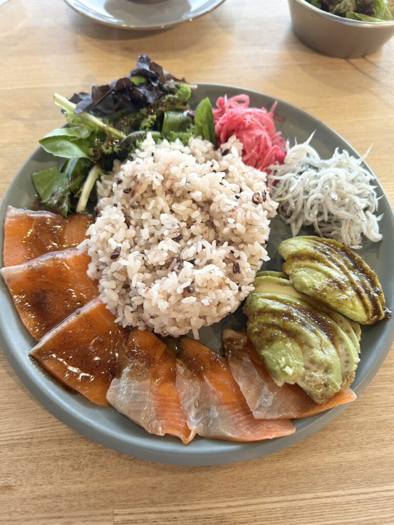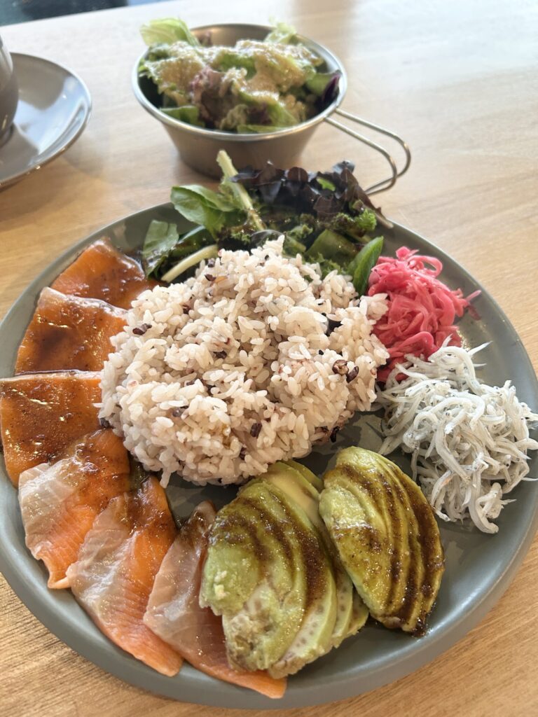 続いて、メインと、サイドメニューの、サーモン・アボカド・しらすの十五穀米ボウル、グリーンサラダ。最初から決めていた一品。